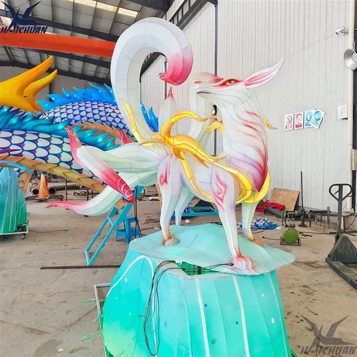 مخلوق صيني أسطوري على شكل ثعلب له تسعة ذيول. نحن نستخدم سلكًا حديديًا سميكًا وإطارًا فولاذيًا لحامًا على شكل ثعلب ذي تسعة ذيول، مثبتين على الشكل بحزام مصباح متغير اللون، وسطح الجسم مع روابط حريرية، وأخيرًا، سيجعل الرسام المحترف هذا الثعلب ذو الذيل التسعة أكثر ذكاءً وجمالاً.